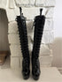 A declaration of dominance disguised as footwear. The Delight-2023 boots rise to the knee in slick black stretch, laced tight for drama and desire. Balanced on a pointed stiletto heel with a 1 ¾" platform rise, every step is a statement—unyielding, unapologetic, and dangerous in its allure. A full inner side zipper offers ease without breaking the spell. Vegan-friendly and darkly divine, these boots were made for those who rule the night.