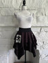 Layers of mischief and mayhem. This kerchief-hem skirt stacks black and red striped panels with a sheer spiderweb layer for a look that’s both gothic and playful. Patches add personality—Hell Bunny’s bunny-and-crossbones and a cartoon emo girl throwing the rock-on sign. Zipper accents and safety-pin Xs complete the rebellious detailing. Falling from mini to knee length in asymmetrical tiers, the Anarchy Bunny Skirt is equal parts cheeky and defiant, built for those who wear their attitude loud.